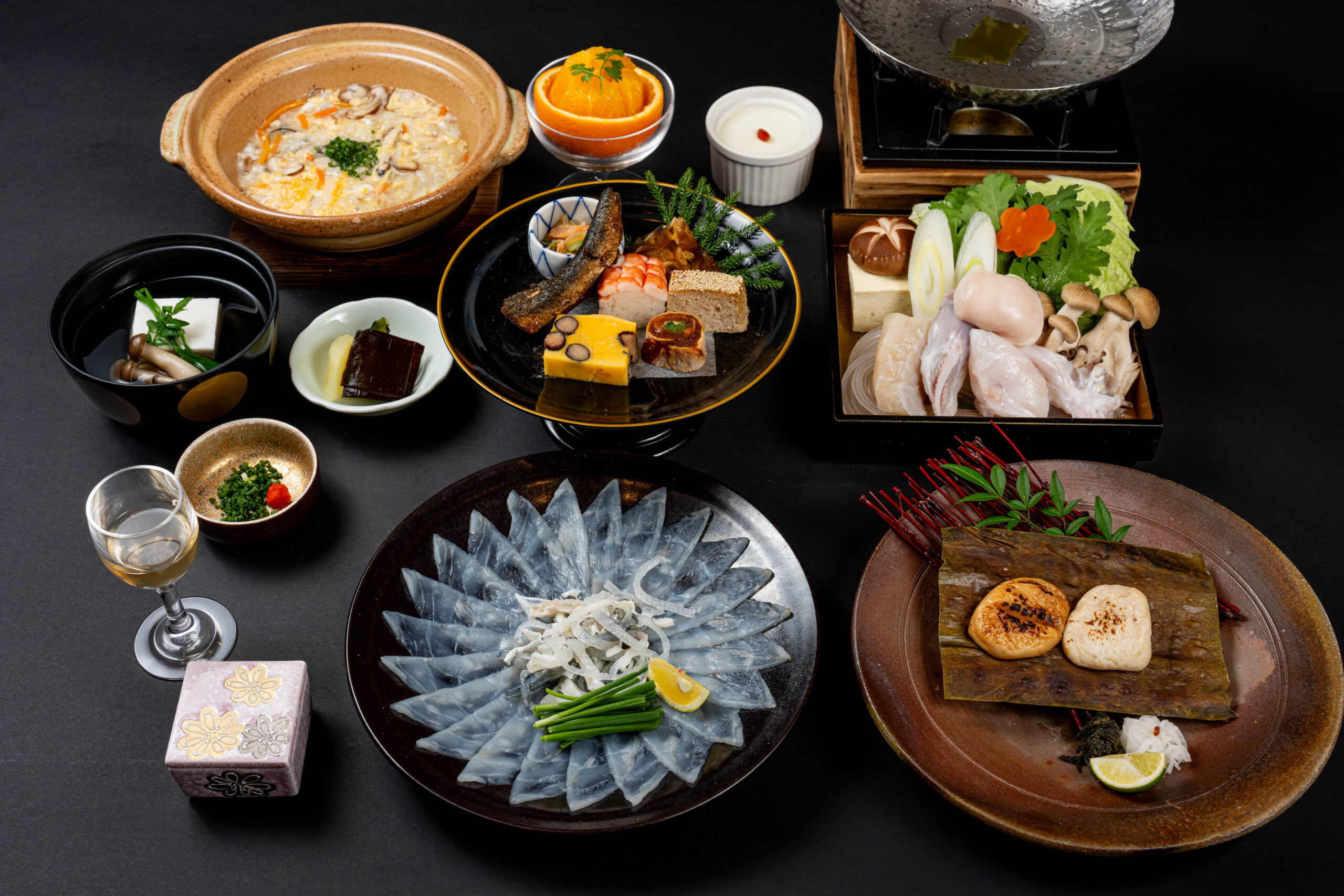 食前酒/先付/前菜五種/とらふく薄造り/とらふく白子のみぞれ餡かけ/ふく唐揚げ/白子付きとらふくちり鍋/とらふく雑炊・香の物/水菓子
