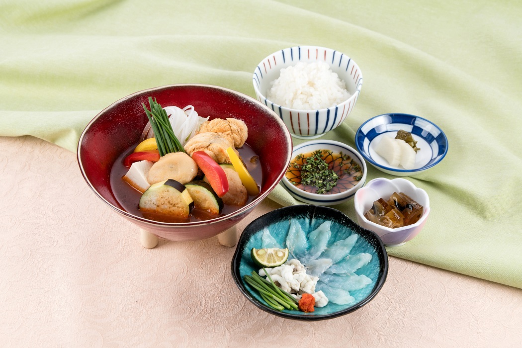春帆楼特製だいだいぽん酢と紅葉おろしでさっぱりとお召し上がりいただく真ふぐの刺身と、味噌ベースのピリ辛の味付けがクセになる真ふぐチゲのセットです。