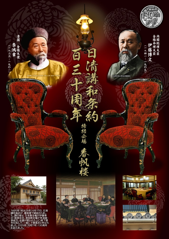 1895年3月19日、百名を超える清国使節団を乗せた船が亀山八幡宮沖に到着。日本側からは伊藤博文と陸奥宗光が全権弁理大臣として、清国側からは李鴻章が講和全権大臣として、両国代表合わせて11名が会議に臨みました。講和会議は、当時の春帆楼二階大広間を会場に繰り返し開催され、同年4月17日に日清講和条約(下関条約)が締結されることとなります。
